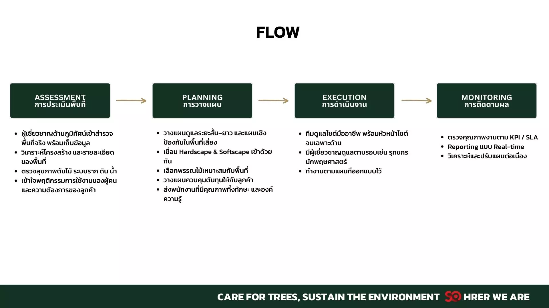 SO GREEN ใช้แนวทางที่แตกต่าง ด้วยการนำทีมผู้เชี่ยวชาญเฉพาะทาง เช่น รุกขกร (Arborist) ผู้เชี่ยวชาญด้านภูมิทัศน์ และนักพฤกษศาสตร์ เข้ามามีบทบาทตั้งแต่การประเมิน วางแผน ไปจนถึงการดำเนินงานจริง ครอบคลุมตั้งแต่การตรวจสุขภาพต้นไม้ การวิเคราะห์ดินและน้ำ ไปจนถึงการออกแบบแนวทางการตัดแต่งและบำรุงรักษาที่สอดคล้องกับวงจรชีวิตของพืชแต่ละชนิด แนวทางนี้ช่วยให้องค์กรสามารถรักษาทรัพย์สินด้านภูมิทัศน์ ลดความเสี่ยงจากอุบัติเหตุ และควบคุมต้นทุนการดูแลในระยะยาวได้อย่างมีนัยสำคัญ