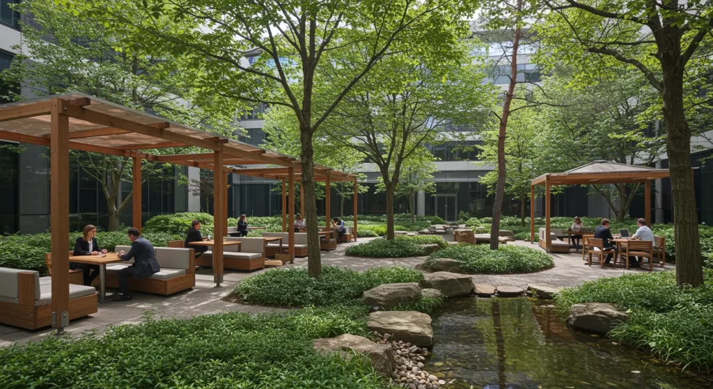 องค์กรส่วนใหญ่เลือกออกแบบสวนป่าให้ล้อมรอบอาคารสำนักงาน โดยวางโครงสร้างให้มีทางเดินธรรมชาติให้ผู้ใ้สถานที่ได้เดินพักผ่อนระหว่างวัน โดยภายใต้ความร่มรื่นและสวยงามนั้นจะมีระบบการบริหารจัดการน้ำซ่อนอยู่ ทั้งน้ำดี น้ำเสีย และการระบายน้ำในช่วงฝนตกหนัก นอกจากนี้ยังใช้ปุ๋ยอินทรีย์ ในการบำรุงรักษาต้นไม้เพื่อลดสารพิษตกข้างในระบบสวนที่อาจะส่งผลต่อนแหล่งน้ำและส่วนอื่นๆภายในสำนักงาน สวนแห่งนี้ไม่ใช่เพียง “ความเขียว” แต่เป็นพื้นที่ที่ทุกคนในองค์กรสามารถใช้ได้จริง